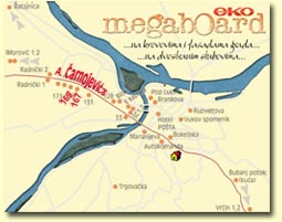 Deo autoputa Beograd-Zagreb kroz Novi Beograd, 2 panoa, jedna strana iz pravca Zagreba sa desne strane autoputa treći soliter u nizu, druga strana iz Beograda ka Zagrebu sa leve strane autoputa drugi soliter u nizu, preko puta Genex kule, panoi postavljeni 2002.